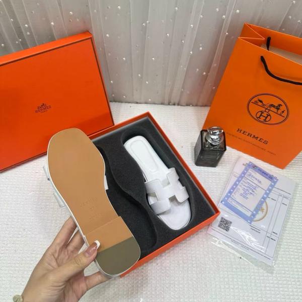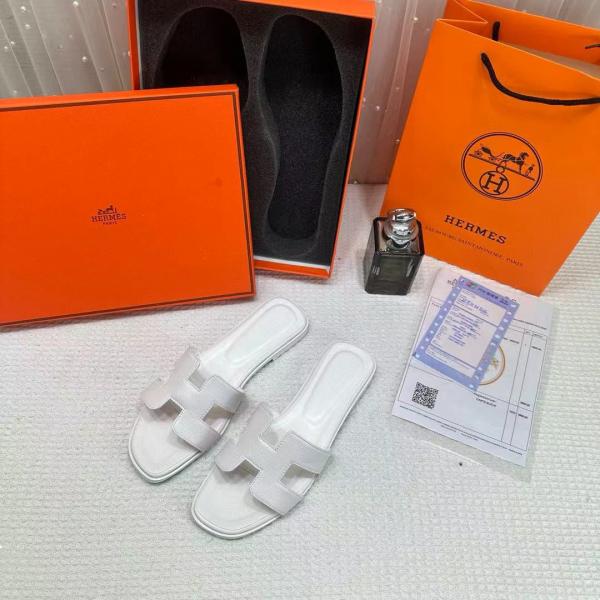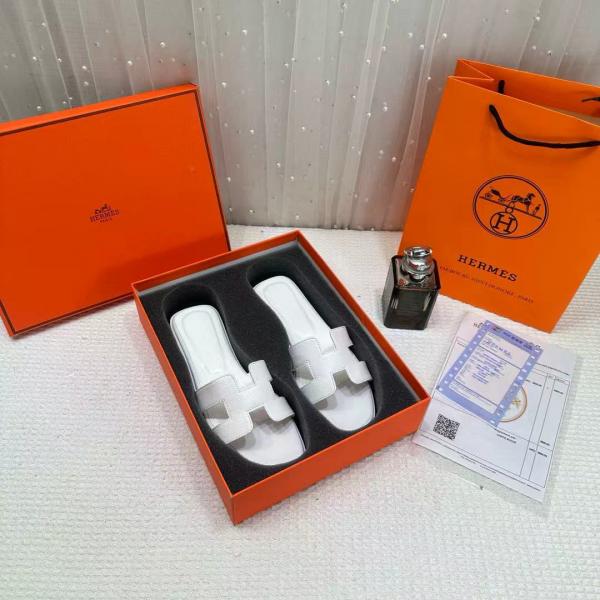 Hermes Paris Oran Flats For Her With OG Box & Carry Bag All White Slide H38 White