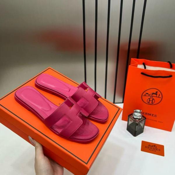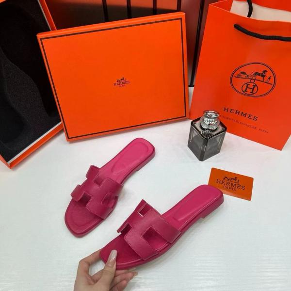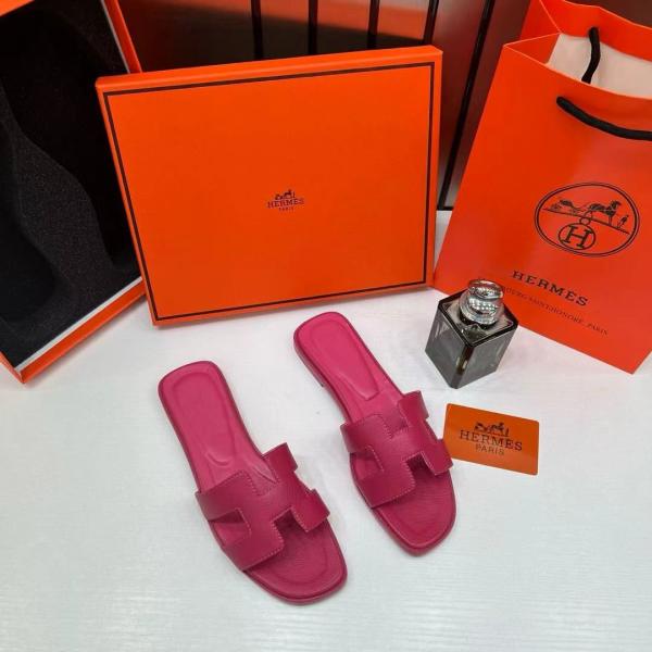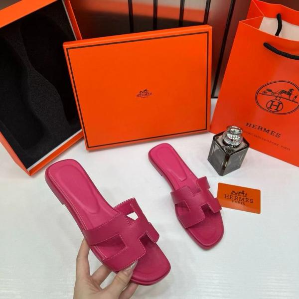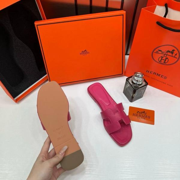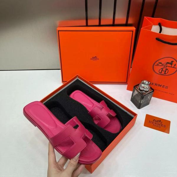 Hermes Paris Oran Flats For Her With OG Box & Carry Bag Rose Red Slide H38 Rose Red