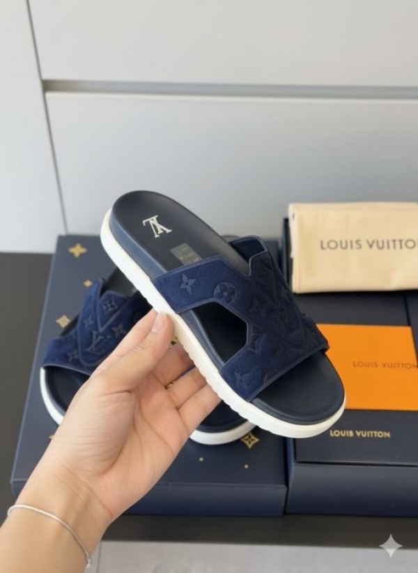 Louis Vui_ton monogram suede riviera flat mules navy blue
